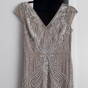 Deco beaded dress with a warmer tone and white and ivory beads.