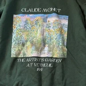 Green sweatshirt featuring Claude Monet's 'The Artist's Garden at Vétheuil' print. In excellent condition.