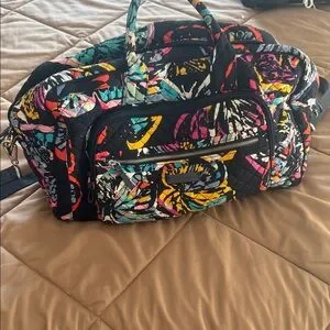 Stylish quilted travel bag. Features vibrant multicolor pattern. Front zip pocket for easy access. Comfortable handles and detachable strap.