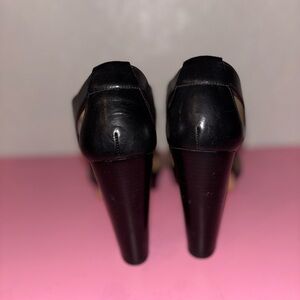 Elegant black leather heels. Features gold zipper detail. Perfect for any occasion.
