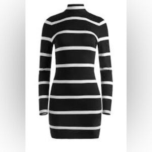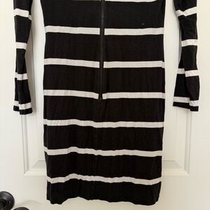 Featuring a classic black and white horizontal stripe pattern, this form-fitting knit dress offers a sophisticated yet trendy look. Perfect for a night out, a casual gathering, or dressed up for an event. Versatile and comfortable, a must-have for your wardrobe. Good preowned condition.
