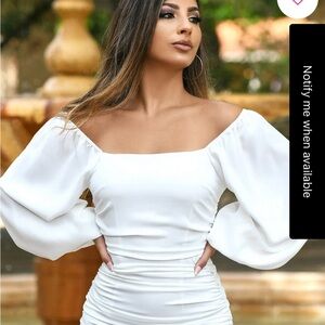 Elegant white dress with long sleeves. Off-shoulder design. Perfect for formal occasions. Brand new. Never worn.