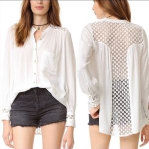 Elegant white blouse with lace back. Features front pocket and button-up style. Lace accents on sleeves.