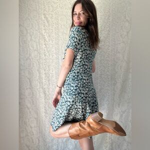 Sweet late 80s floral mini dress by Another Thyme in a deep green with ivory florals and bow-tie detailing. The structured empire waist and rayon blend fabric give it a soft, romantic drape. A contrast dotted lining peeks through the pleats for added detail. Style it with Mary Janes and frilly socks, or pair with tall boots and a cardigan for an early fall look. Works well with a denim jacket or layered under a chunky sweater for cooler weather too.