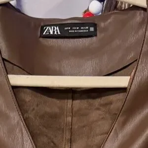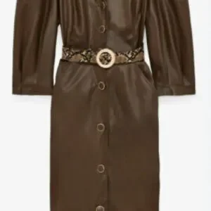 Elegant faux leather dress with button-down front. Features a stylish belt for a tailored fit.