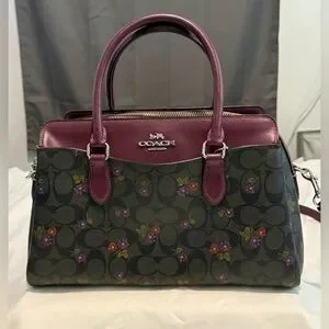 Chic Coach satchel with floral accents. Burgundy handles and trim. Perfect for stylish outings.