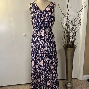 Pink and blue print high waisted sleeveless sundress 19“ pit to pit 57” long