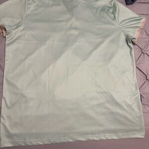 Stylish men's polo shirt featuring a soothing green color with a contrasting tan collar. Perfect for casual outings or a relaxed office look. Cross design, new, never worn.