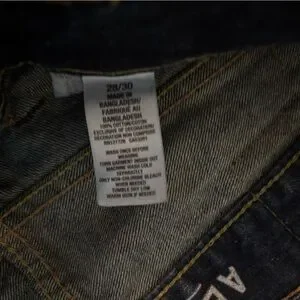 Aeropostale slim bootcut jeans for boys, size 28x30 (Youth Large). Features a dark wash with light fading and slight distressed details on front and back. Classic 5-pocket design with zip fly and button closure. Great everyday jeans with a modern slim fit through the thigh and a subtle bootcut leg opening.
