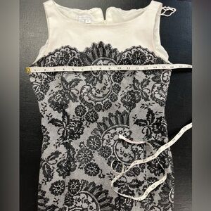 White sheath-style dress with black lace print.