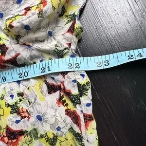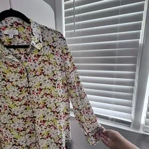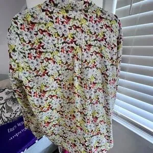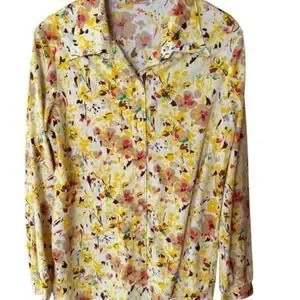 Elegant blouse with floral pattern. Features vibrant yellow and red hues. Ideal for casual or formal wear.