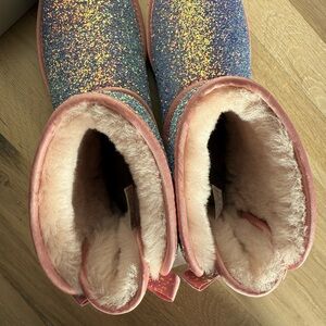 the UGG® Classic Mini Bow Cosmos boots' glittery chunky shape is lined with genuine sheepskin and finished with satin bows in the back