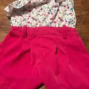 Adorable jumpsuit with floral ruffle top. Bright pink bottoms. Ideal for fun outings.