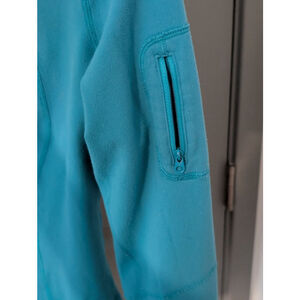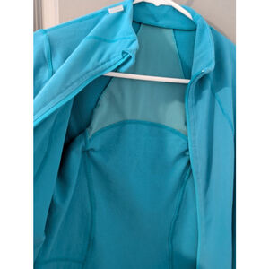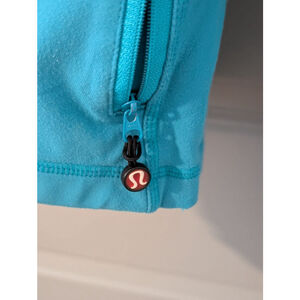 This is a pre-owned Lululemon jacket in a vibrant turquoise color. It features a full front zipper with the Lululemon logo. The jacket has long sleeves with thumbholes and a zippered pocket on the left sleeve. There is a minor pilling throughout the fabric, particularly around the cuffs and hem. The jacket also has a small Lululemon logo on the back.