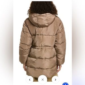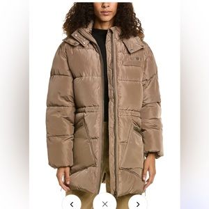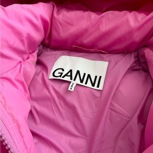 Stylish pink puffer jacket by Ganni. Features a hood and front zipper. Large front pockets for convenience.