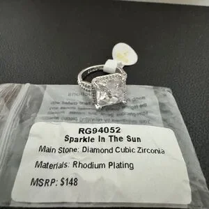 Bomb Party OG size 7. Shine bright with the Sparkle In The Sun ring, featuring a dazzling diamond cubic zirconia set in rhodium plating. A perfect accessory to elevate any look.