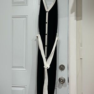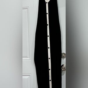 Chic black dress with white trim. Features button accents and a stylish belt.