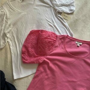 Set of three tops with eyelet sleeves in white,navy, and dark pink. Perfect for casual wear. Would love to sell as a lot. All NWT size 1X. Bought from Macy’s.