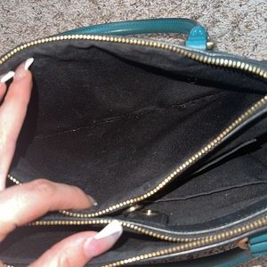 Elegant black satchel with teal handles. Gold-tone hardware. Signature Coach logo.