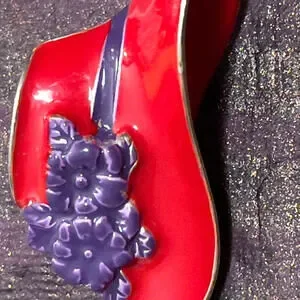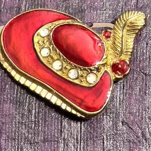 2 of the red hat brooches are of unknown designers. But, the darker red enamel larger floppy hat with a side flower is a Liz Claiborne brooch (LC) and is signed on the back.
