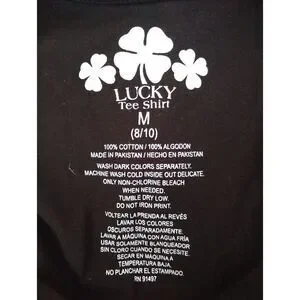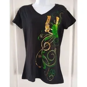 New without tags Saint Patrick's Day Black V-Neck Tee Shirt Medium (8/10). Decorated with green shamrock and a gold horseshoe.