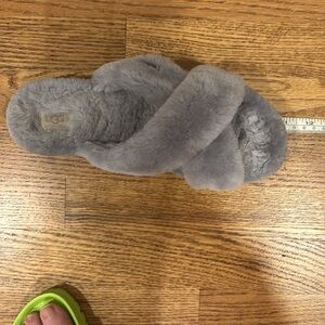 Soft and plush slippers by UGG. Used, but plenty of life left. Nice, non slip sole. I cut the itchy tag off, see measurements, authentic. Perfect for lounging in comfort.