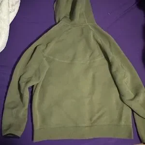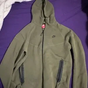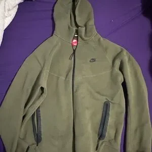 Cozy Nike fleece hoodie in charcoal with navy accents. Features zip pockets and a sleek design. Used but in great shape