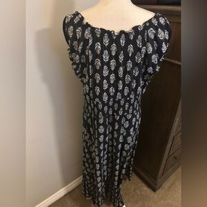 This elegant black and white dress features a charming leaf print, perfect for any occasion. Its classic design offers both style and comfort. Can be dressed up or down.