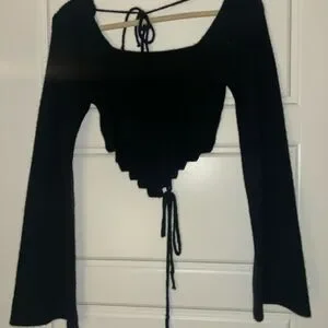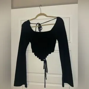 This elegant black knit top features a stylish design with a unique tie-back detail. This is a cropped sweater! Very soft