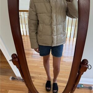 Cute, warm, & cozy 7 For All Man Kind puffer jacket! 🧥 This jacket is really warm & cozy for fall & winter months. It has button-up closure & high neck to protect from the cold. Two deep front functional pockets. Seller in photos is 5’3”, 32a cup size, short torso & this fits perfectly & can still have thick layers underneath for warmth!