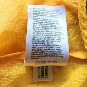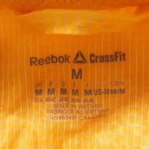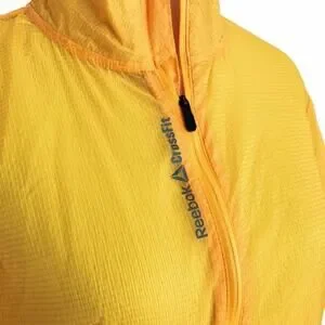 Incredibly lightweight, semi-sheer, zip-front athletic jacket from Reebok's collaboration with CrossFit. Brilliant orange-ish yellow with gray writing/trim. The nylon fabric appears to have a rip-stop quality, and my guess is that it's water-resistant. CrossFit is printed in block letters down the left arm, and the back bears the slogan "The clock is watching." This would be a great windbreaker for outdoor exercise!