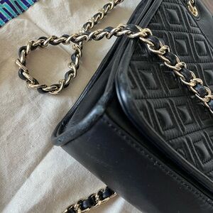 Elegant black quilted shoulder bag with chain straps. Perfect for any occasion. There are small signs of wear around the ribbing (pictured).