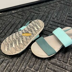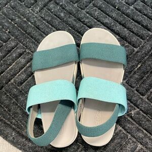 Stylish Keen sandals with dark green and light blue straps. Ideal for everyday wear.