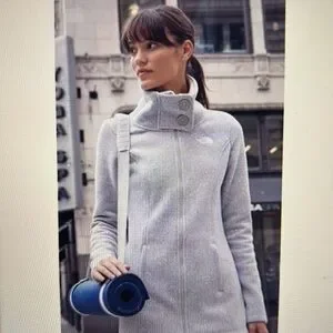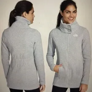 The North Face (retired) Lunabrooke sweater jacket perfect for going into the cooler seasons with a long fitted full zip sweater jacket. Features a high collar and button accents, fully lined with feather soft fleece.