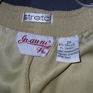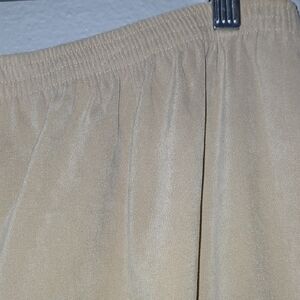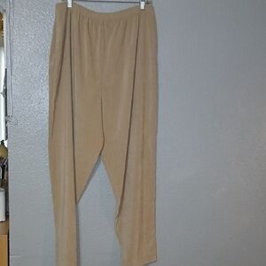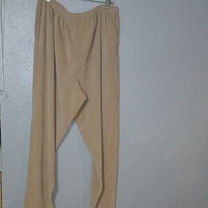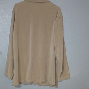 Elegant creamy tan zip-up jacket. Long sleeve, Pit to pit measures 26 inches, Pit to hem measures 17,5 inches. Long pants with elastic waist. Flat measures 17 5 inches. Inseam measures 30 inches. Two side slit pockets. Ideal for versatile styling. 97% polyester, 3% spandex. Size 2x.