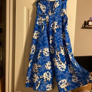 Chic blue jumpsuit with bold white floral pattern. Strapless design with a flattering fit. Ideal for casual or dressy occasions.