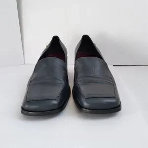 Stylish 90's Navy Leather 'Status' Slip On Square Toe Block Heel Shoes Sz 8.5
