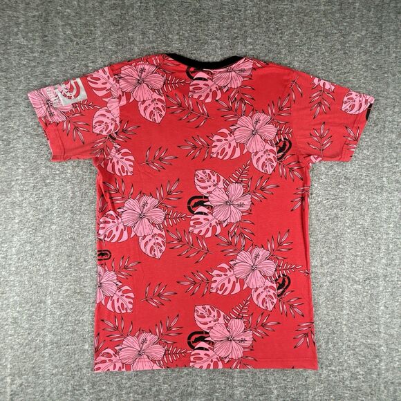 Retro-inspired Ecko Unltd graphic T-shirt featuring a vibrant red tropical floral print and oversized metallic silver logo across the chest. Perfect for fans of Y2K streetwear, urban fashion, or 2000s nostalgia.