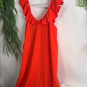 Step out in style with this chic orange midi dress. Featuring a playful ruffled neckline, it's perfect for any occasion.