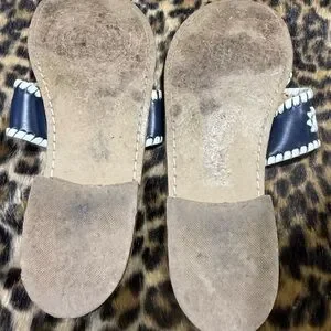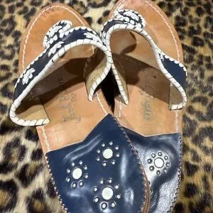 Elegant navy sandals with white floral details. Perfect for casual wear.