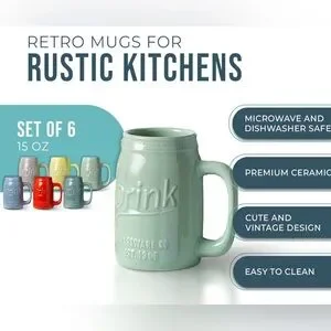 Ceramic mason jar mugs: Enjoy your favorite drinks using vintage, Mason jar mugs with handle! Our set of 6 mugs is the perfect addition to your home and perfectly match rustic, farmhouse decor. Delight your guests and serve coffee, tea, lemonade and more in special, vintage mugs.