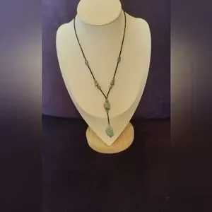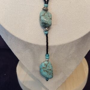 This necklace features a stunning combination of black seed beads, silver tone beads, and real turquoise beads. Perfect for adding a touch of sophistication to any outfit. Easily wearable daily. This is handmade by a Western New York artist in their 80s. The necklace opening is 16 in. and the pendant drop is a total of 3 in.