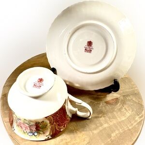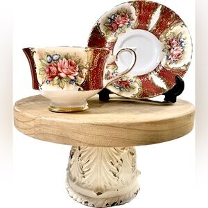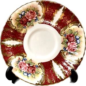 Pristine condition. Roses with cranberry red panels. Saucer is 5-1/2” Bone China. Made in England.