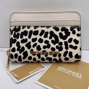 Stylish Michael Kors wallet. Features black and cream leopard print. Gold-tone logo and zipper.
