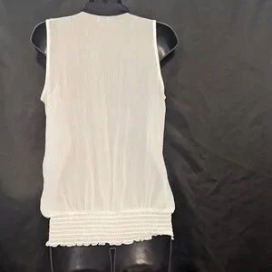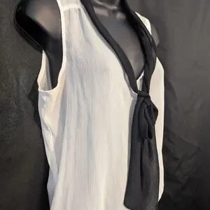 Chic sleeveless blouse with a stylish black tie. Features a soft semi-sheer white fabric. Ideal for versatile wear.