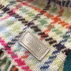 Vibrant plaid wool scarf with fringe detailing. Features a mix of colors including pink, orange, and blue.