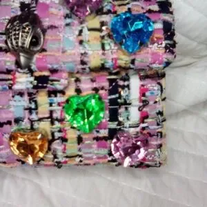 Vibrant crossbody bag with colorful gem embellishments. Features a woven multicolor design. Chain strap adds elegance.