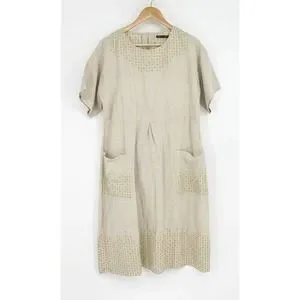 Elegant beige midi dress. Features subtle patterned accents. Short sleeves and practical pockets. Perfect for casual wear.