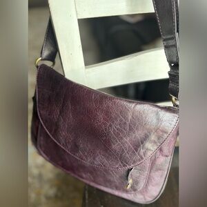 Calling all purple lovers! Premium handcrafted leather in a compact design. This stylish purple leather shoulder bag is perfect for any occasion. Its sleek design and rich color make it a versatile accessory for your wardrobe. Zipper compartment under flap and on the back. Plenty of storage inside plus a window ID slot, additional card slots and pen holders. Measures approximately 13”w x 10” high. Should strap is adjustable up to 23”. Excellent condition. Smoke free home.