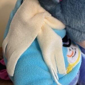 -beautiful Eeyore plush in his typical downtrodden pose wearing a snowman sweater